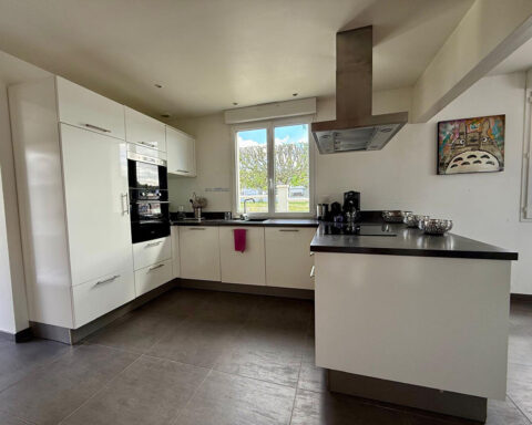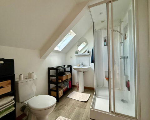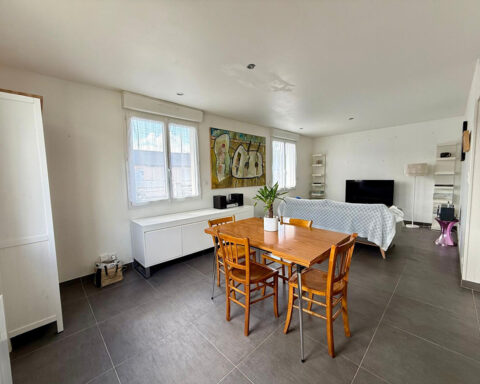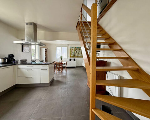 Au rez-de-chaussée vous trouverez : une entrée desservant une pièce de vie lumineuse avec salon/salle à manger exposée sud-ouest, ainsi qu'une cuisine ouverte aménagée et équipée. Vous y trouverez également une chambre avec salle d'eau et WC privatifs, une buanderie et un WC indépendant avec lave-mains.