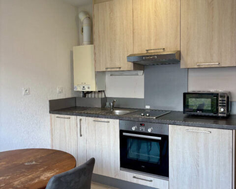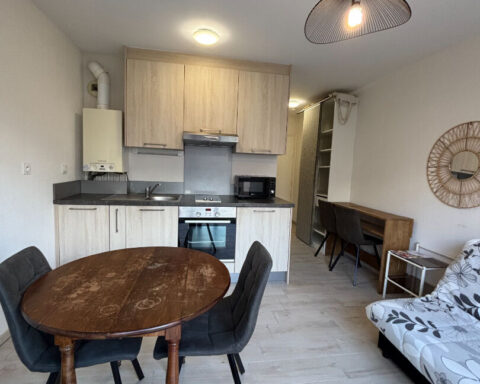 Il dispose d'un entrée, un séjour avec cuisine ouverte aménagée et équipée (meubles de rangement, hotte, plaques de cuisson, four, lave-vaisselle, réfrigérateur), et une salle d'eau avec WC (et branchement pour machine à laver).